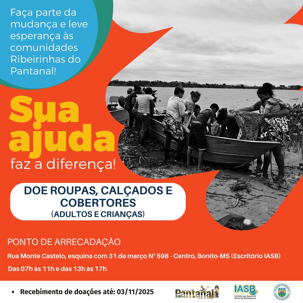 Iniciamos a campanha 2025 de arrecadaçaõ de roupas, calçados e cobertores, voltada para atender famílias e crianças das comunidades ribeirinhas do Pantanal. As doações serão entregues durante a 10ª Expedição de Educação Ambiental no Pantanal, que ocorrerá de 10 a 22 de novembro de 2025, em Corumbá-MS.